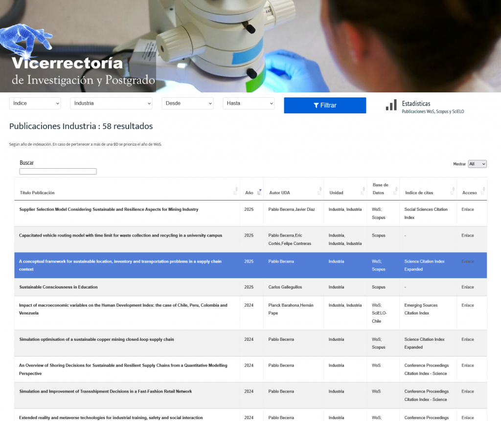 NÚMERO DE PUBLICACIONES (HASTA NOVIEMBRE 2025) WOS:25SCOPUS:39SCIELO:26TOTAL:58 Nota: Algunas publicaciones son de más de un tipo. Pulsa en la imagen para más detalles utilizando filtros